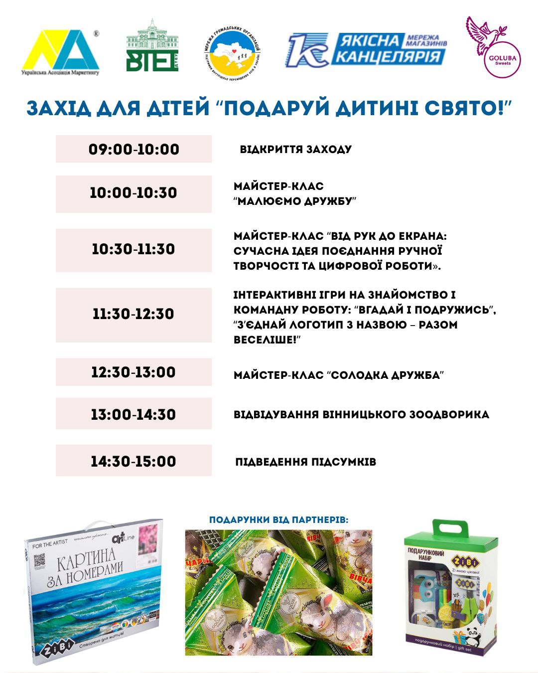 2 червня 2025 року у Вінниці відбувся яскравий дитячий захід «ПОДАРУЙ ДИТИНІ СВЯТО!», організований ГО «Мережа громадських організацій підтримки внутрішньо переміщених осіб в Україні» спільно з ГО «Українська Асоціація Маркетингу» та Вінницьким торговельно-економічним інститутом ДТЕУ.