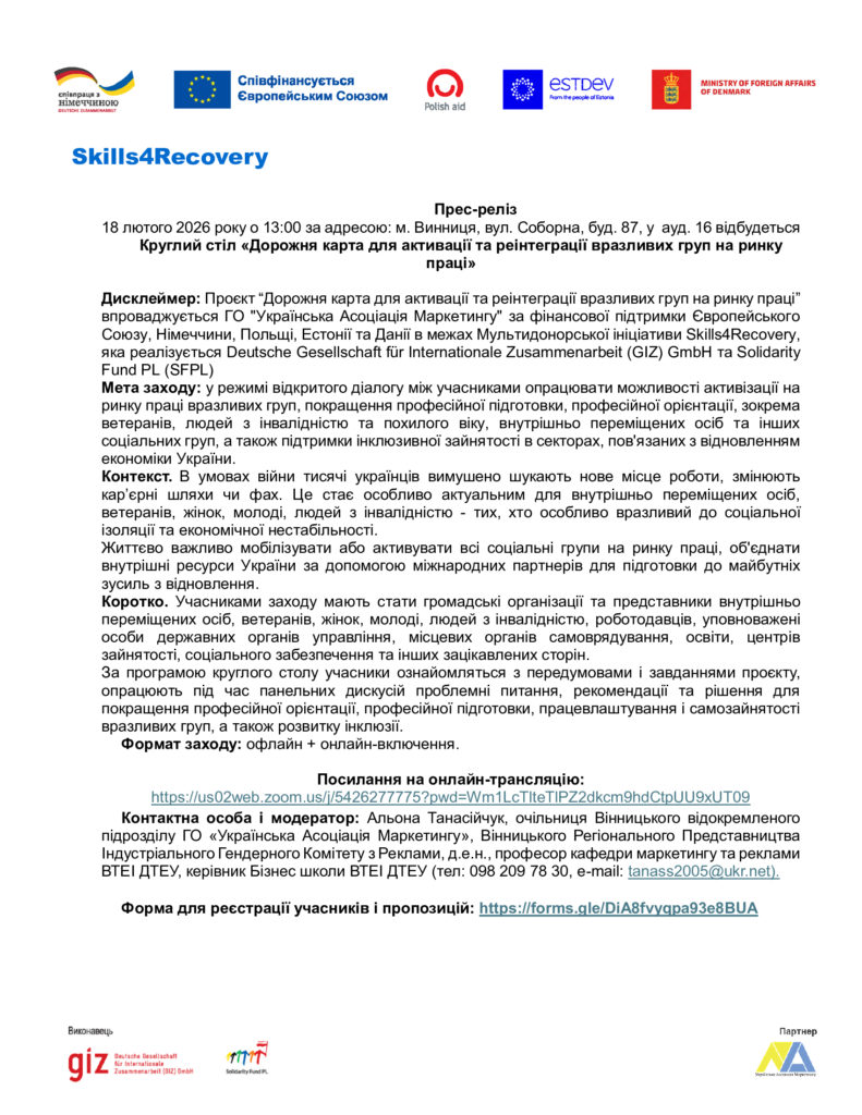 Дисклеймер: Проєкт “Дорожня карта для активації та реінтеграції вразливих груп на ринку праці” впроваджується ГО “Українська Асоціація Маркетингу” за фінансової підтримки Європейського Союзу, Німеччини, Польщі, Естонії та Данії в межах Мультидонорської ініціативи Skills4Recovery, яка реалізується Deutsche Gesellschaft für Internationale Zusammenarbeit (GIZ) GmbH та Solidarity Fund PL (SFPL)